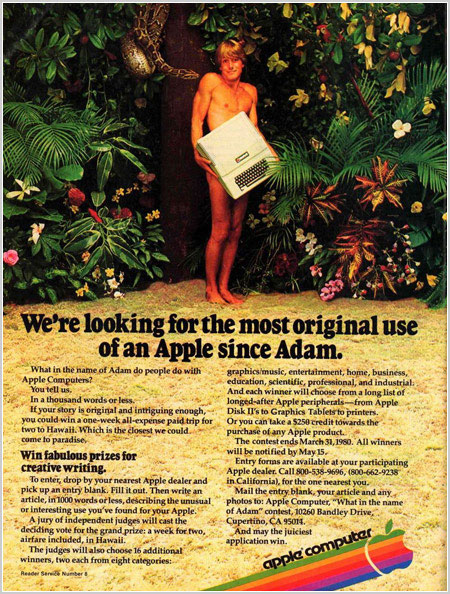 This is Apple’s play on the story of Adam and Eve. The ad is asking customers to write an interesting story about what people use their Apple Computers for.