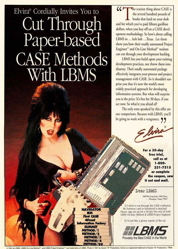 This LMBS advertisement from 1991 makes no sense at all. The description at the side is fine but what is with Elvira, and why is she holding a chainsaw that is trying to look like a computer or something. It’s just one of those ads that boggles your mind.