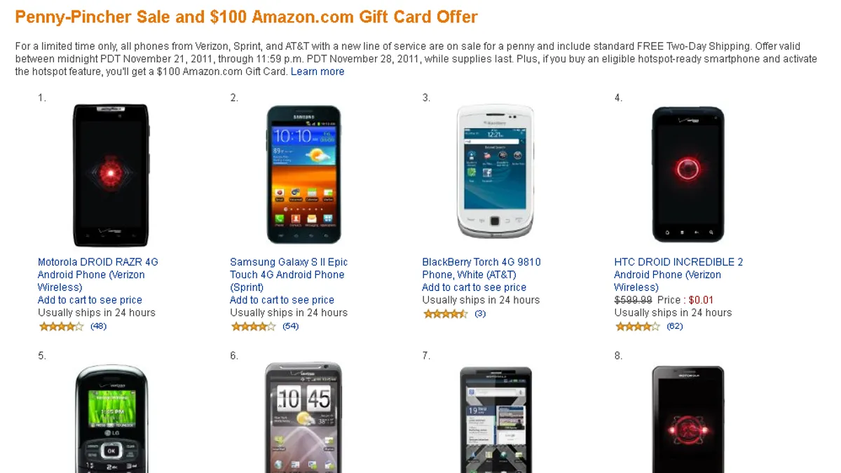 The Kindle Fire was just the start of Jeff Bezos’ and Amazon’s “Holiday Gadget War 2011” against Apple (and everyone else). From now until next Monday, Amazon is selling all non-iPhones for a penny with a 2-year contract.