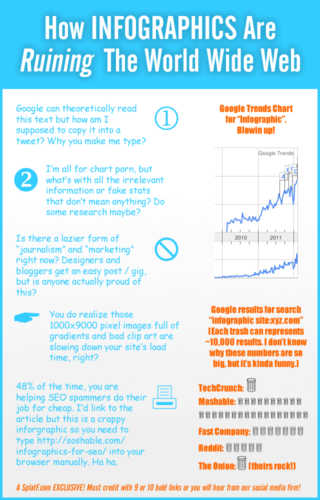 The first complaint is easily addressed. Those who have websites or otherwise share infographics through social media should be certain that the data they’re sharing is accurate. A good infographic will attribute the data with sources normally found at the bottom. Check the sources before sharing. It may be an extra step that can be a pain as they are normally not linked or shortened, but if you’re worried about the data, it’s best to check.