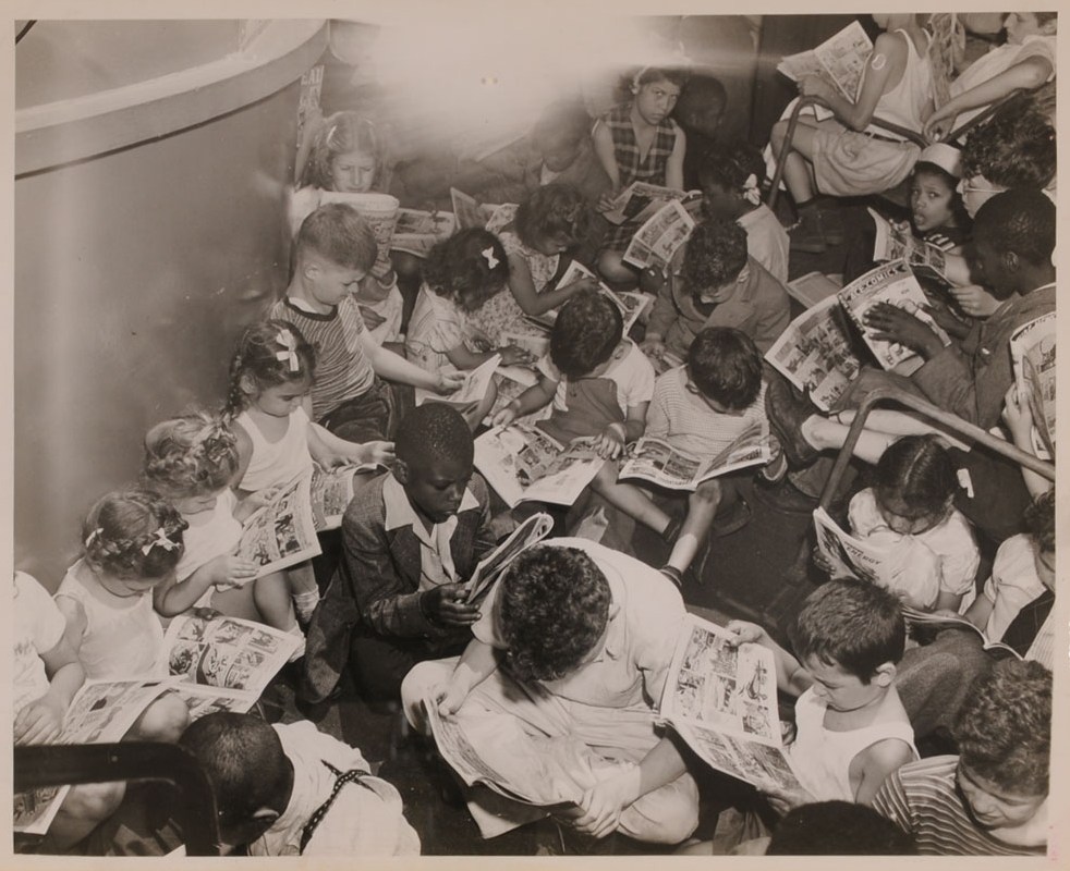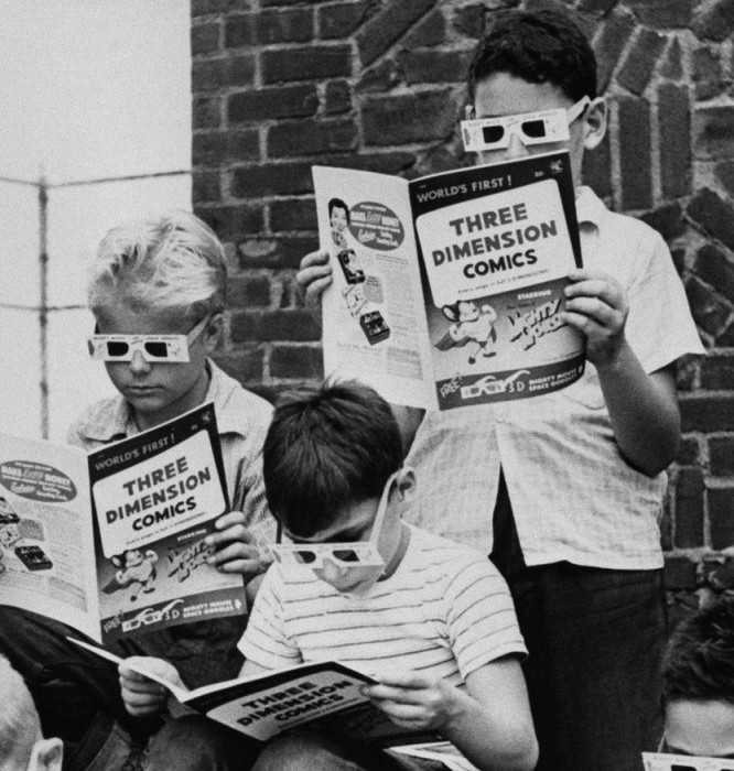 In 1953, St. John Pubications released something that blew the minds of kids and adults alike. 3D had already been seen on static images and through movies, but there had never been a story told in three dimensions on the pages of comic books. They released Three Dimension Comics #1 (Sept. 1953 oversize format, Oct. 1953 standard-size reprint) starring none other than the pint-size superhero of the generation, Mighty Mouse. In the image below, you’ll see some kids candidly engrossed in the pages as the flying rodent popped off the page and into the imaginations of the kids of the generation.