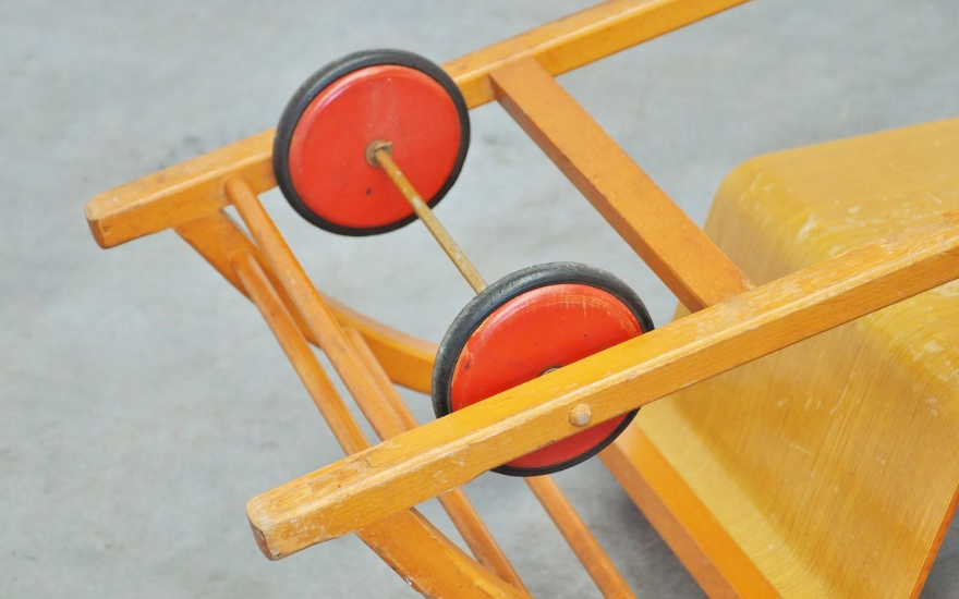This design, artfully constructed out of a Beech wood frame and plywood seating, accented with red rubber wheels makes for a nifty toy car that today looks vintage but would still remain innovative due to its ability to also become a rocking chair.