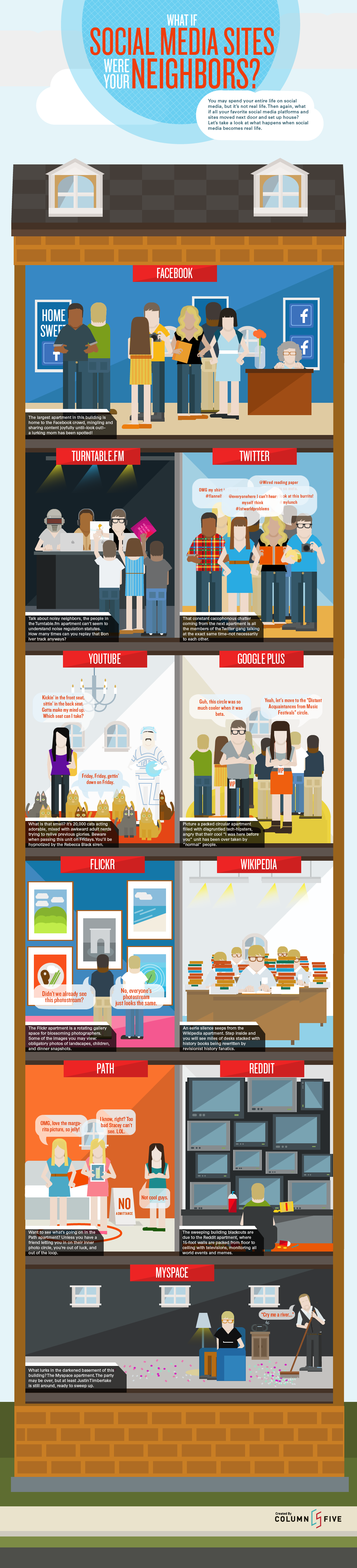 Let’s look at the lighter side of social media. With so many privacy concerns rolling around, turmoil around the world fueled in many ways by social media, and general shenanigans dominating status updates, we want to lighten things up a bit and have a chuckle or two. What would happen if social media sites were actually your neighbors?