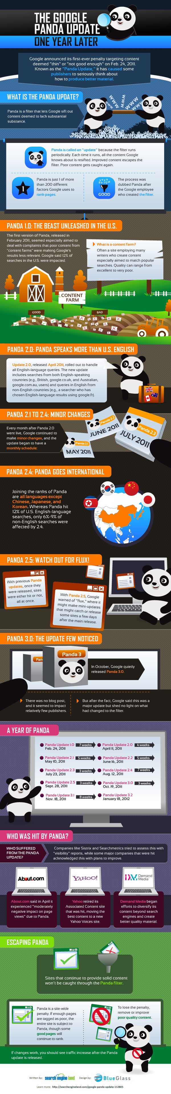 This infographic from Search Engine Land explores the effects of the update as well as the various versions that have come in it’s first year. The real question that needs to be asked, “Is the content Google serves now better than it was a year ago?”