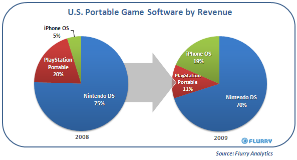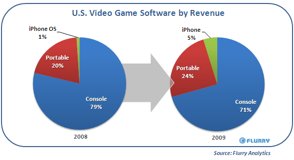 Flurry Analytics says Apple’s surpassed Sony PSP game revenue in the US, estimating the iPhone has seized 5 per cent of the lucrative $10 billion US games industry. That’s up from $115 million in 2008 – near 400 per cent growth.
