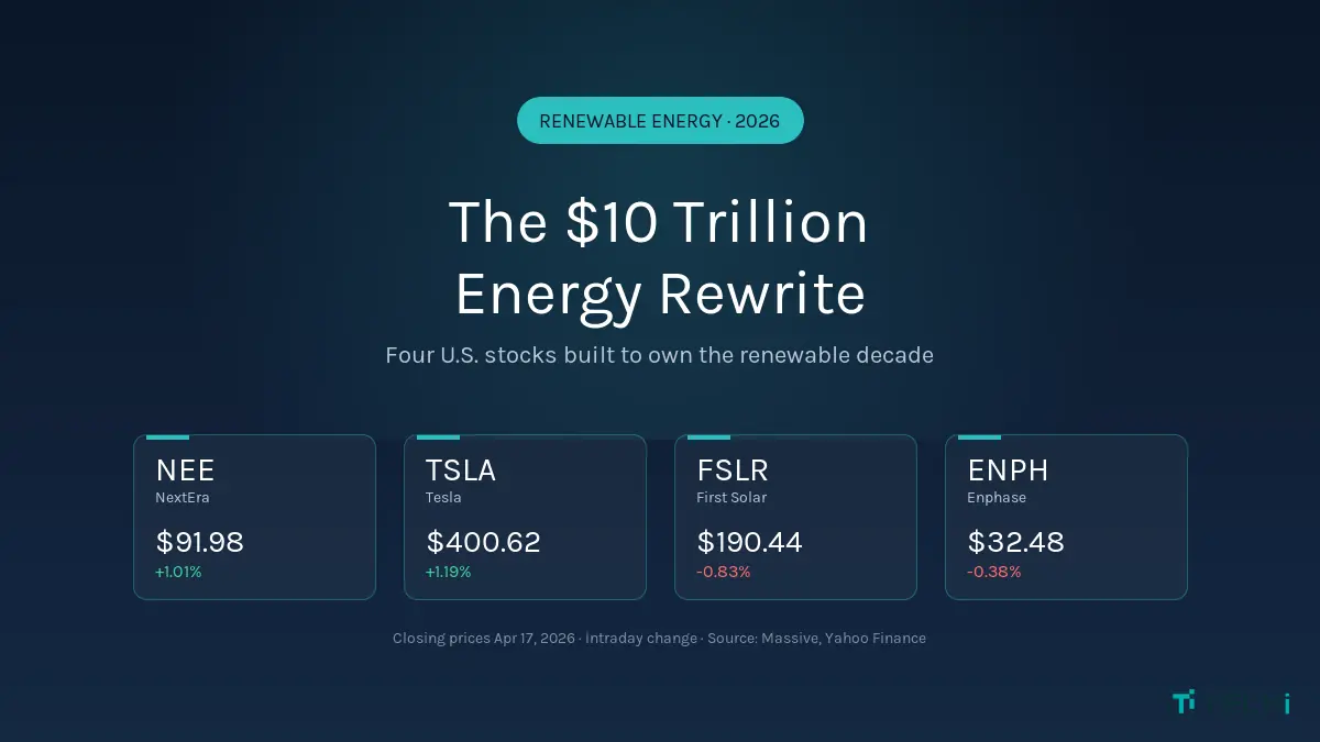 The cost curve is not the story anymore. The story is that the entire U.S. electrical grid has to be rebuilt around what this pricing makes possible, and only a short list of American companies are positioned to take the real money off the table. This is not about rooftop panels or ESG talking points. This is about who owns the generation assets, who builds the batteries that turn intermittent sun into firm capacity, and who controls the grid intelligence layer that stitches it all together. That shortlist runs through four tickers: NEE, TSLA, FSLR, and ENPH. Prices fetched live from Nasdaq market data on the April 17, 2026 close. All four are quoted through this article at verified session values.
