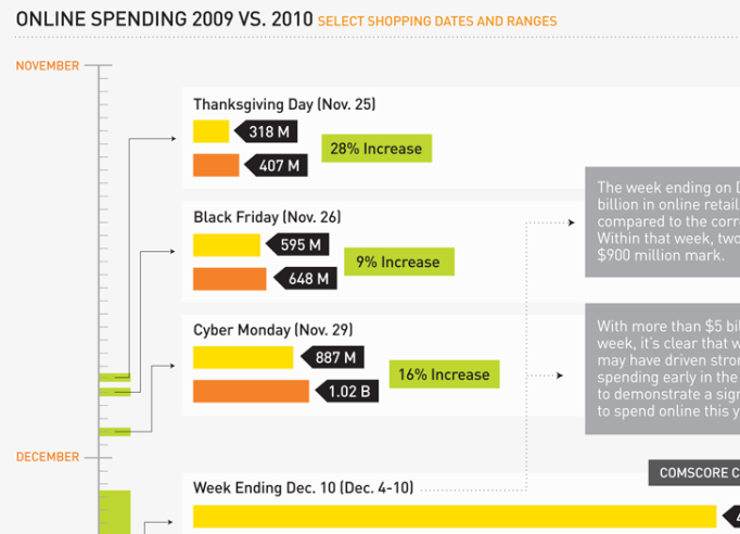 From November 1 through December 10, nearly $22 billion was spent through online shopping. With Facebook looking at eCommerce for businesses in an effort to become the hub for for online shopping, 2011 will likely continue to demonstrate big jumps around the holidays.