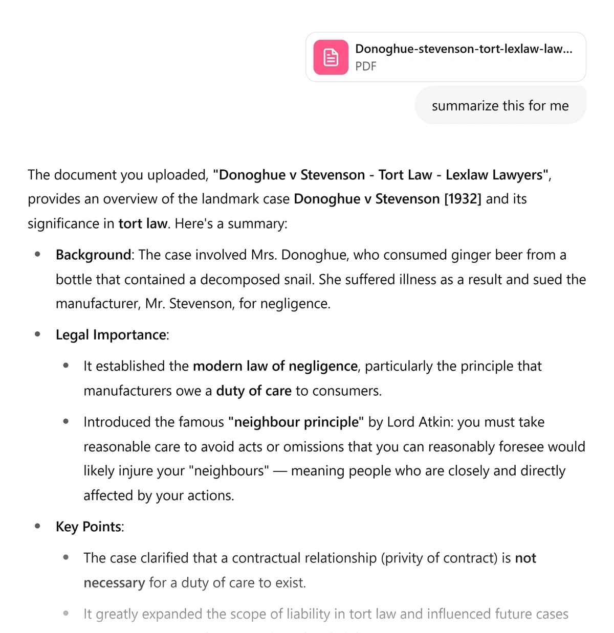 James Martin, Research Journalist at ExploringTopics, tested both ChatGPT and DeepSeek to see who answered well after sharing the file of a famous legal case, Donoghue vs Stevenson. ChatGPT interpreted the uploaded file and provided him with a detailed explanation of the case. But the best part is that it offered him to draw a picture to help visualize the case. But there was a noticeable delay before the diagram appeared, and it looked more like formatted text than an actual visual.