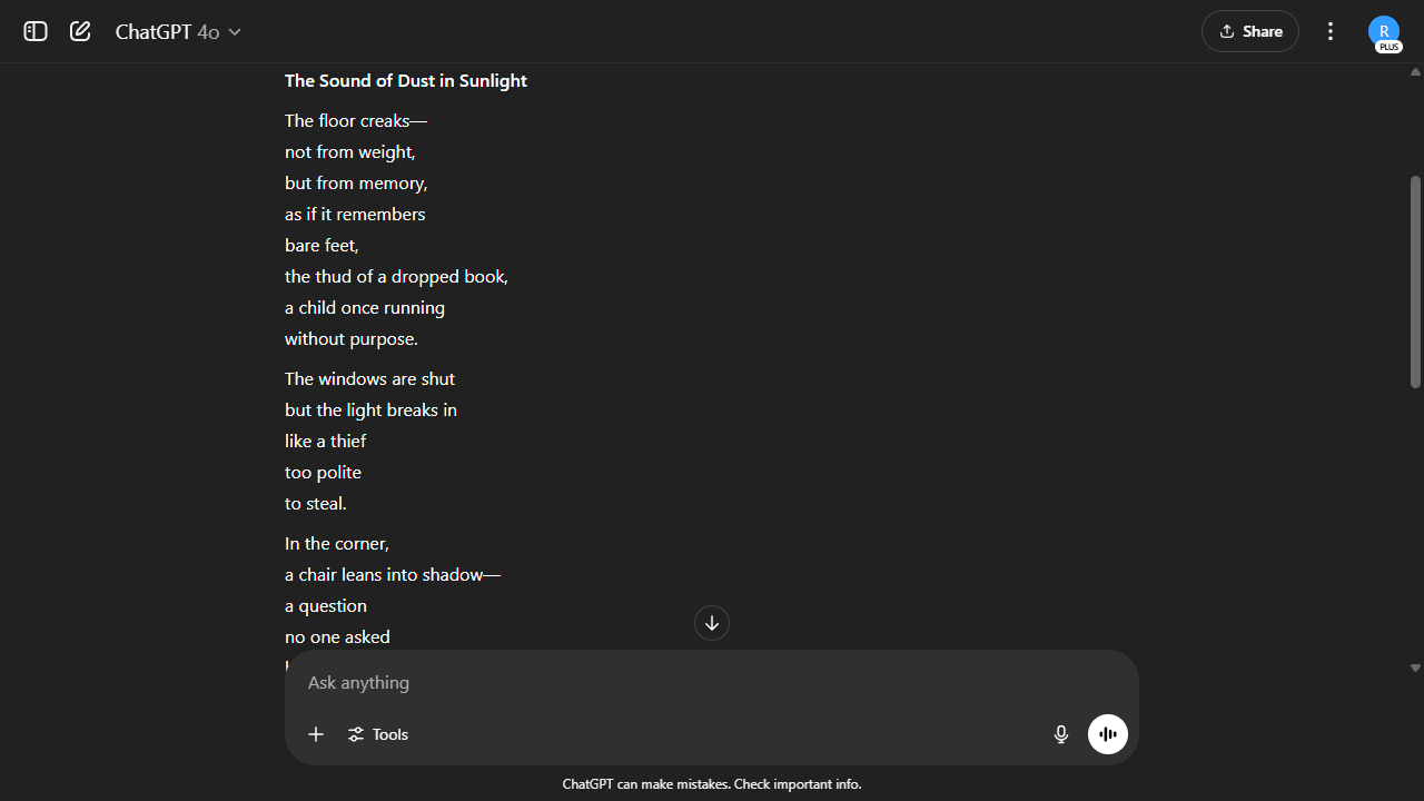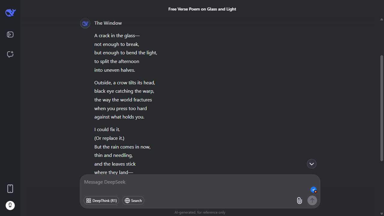 ChatGPT and DeepSeek can write creative pieces like poems, stories, and short plays. Ruben Circelli tested these tools with a similar prompt. He asked them to write a free verse poem with attention to punctuation, line breaks, and rhythm, without any rhyme scheme or familiar meter. They provide a better response, but DeepSeek’s version was very similar to ChatGPT’s, especially in its opening lines and tone.