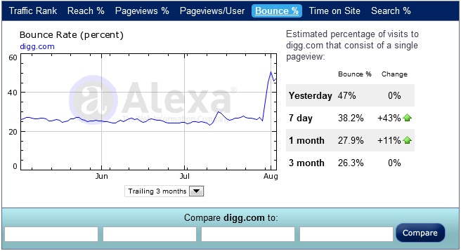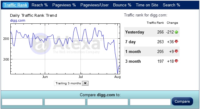 Normally when a website relaunches after a drastic change, particularly after a buyout as Digg was purchased by Betaworks last month, there is a bump in traffic from the buzz surrounding the launch as well as the curious former users who had left the site long before. The exact opposite occurred for Digg when Betaworks launched V1 on July 31st according to traffic tracking site Alexa.