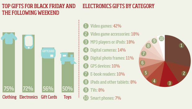 Those days are closer to being behind us as the digital age makes more of an impact on the holidays. As this graphic by our friends at Savings demonstrates, more and more people are turning to electronic gifts such as games, iPads, and GPS devices. 62% of shoppers are likely to buy electronics this year compared to 58% last year. Clothing is still tops on the list at 68%, but as we bow down more readily to our electronic overlords, we may start seeing more Apple logos and fewer Levi’s logos on our gifts in the near future.