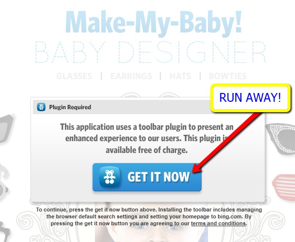 The “terms and conditions” link [on Make-my-baby.com] takes you to http://mmb.bingstart.com/terms/ which has phrases like “If Chrome (“CR”) is installed on your PC we may change the default setting of your home page on CR to Bingstart.com.”