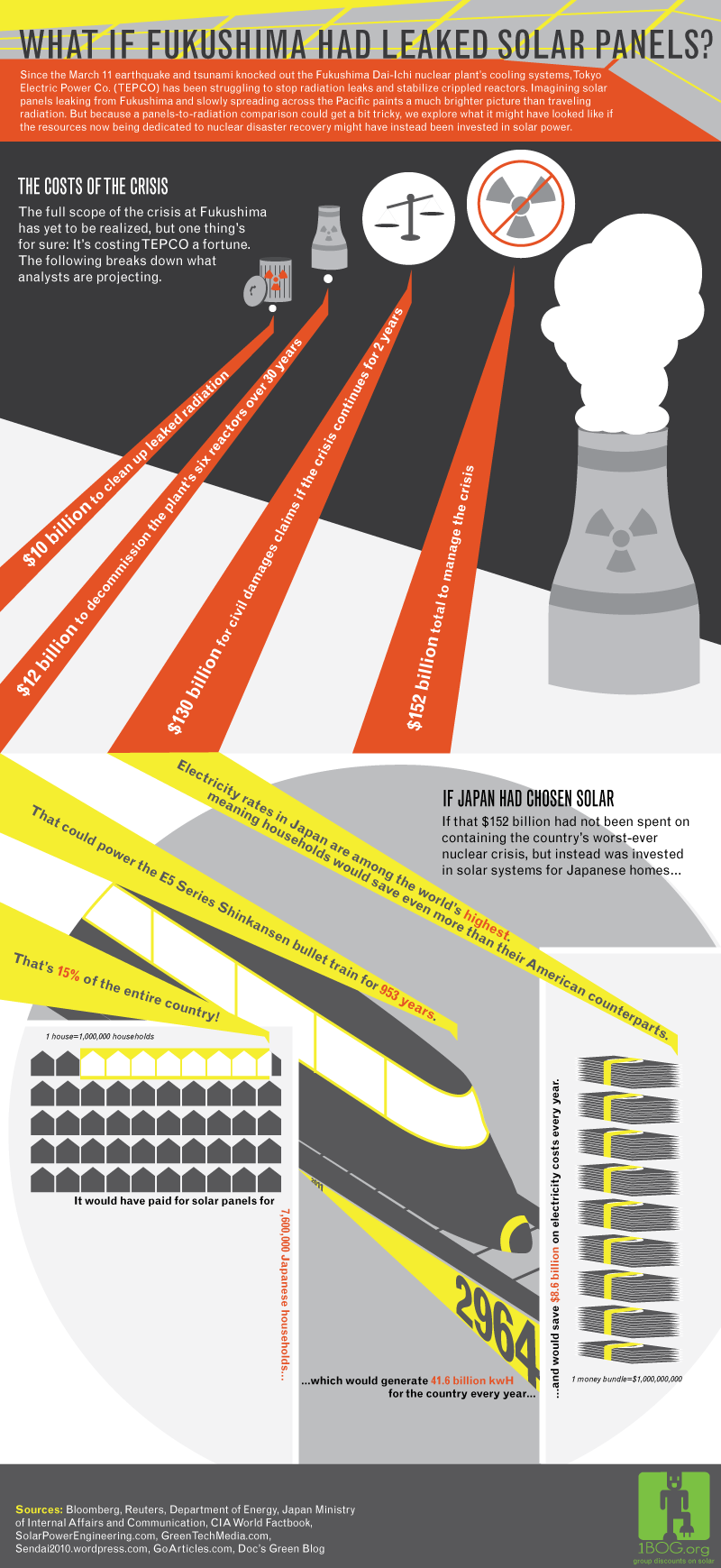 Case in point: this infographic by our friends at 1bog. In it, you’ll see some of key points that make their argument strong in a hypothetical format. Some may consider it unfair to look back with 20/20 hindsight and say “shouldacoulda” but one can’t help to wonder if the situation would be completely different had Japan embraced solar power earlier.