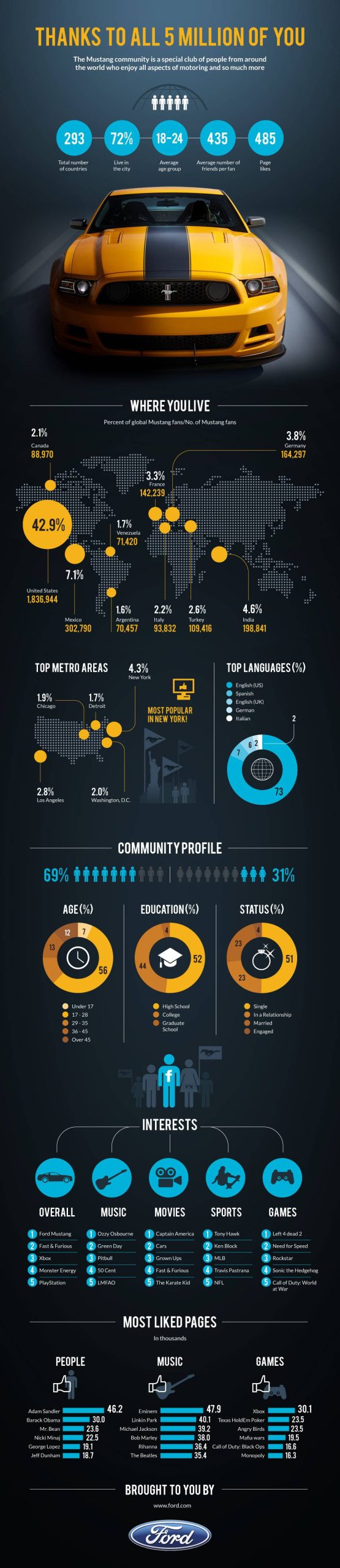 In this infographic from Holiday Automotive, Ford explores the first 5 million Facebook fans on their Mustang page.