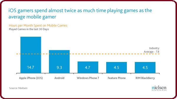 Whether because of superior games available, a different user mindset, or a combination of the two, iOS gamers spend almost twice as much time playing games as the average mobile gamer. Apparently, Apple users just want to have fun.