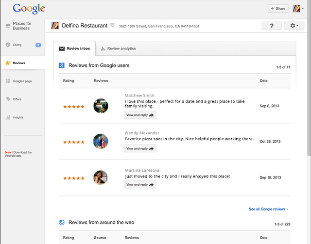 - Public Google+ reviews are linked from the profile page. The image above was taken from such as review list.