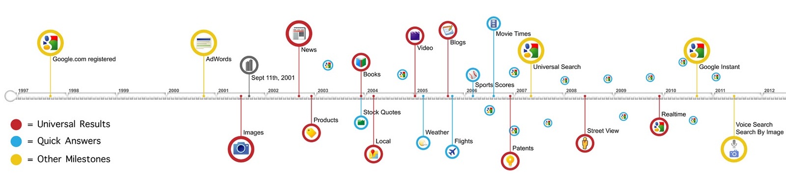 Major developments such as Adwords and Universal search made the company both more profitable and more useful to the users. Here is the evolution of search as described by the source.