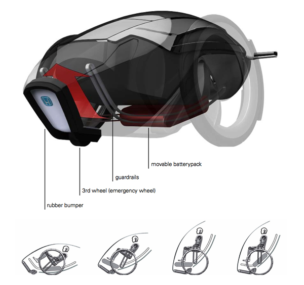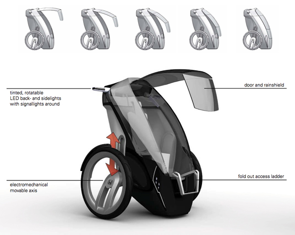 It’s not a car, nor is it a motorcycle, so don’t expect it to pop up at your local Honda dealer any time soon. In essence, it’s a pod, a very sleek and attractive pod that looks as stylish as it looks unsafe.  While we won’t get into the practical applications of safety by wondering what would happen if it got hit by a Toyota Landcruiser, we can definitely focus on the positive practical applications that his sort of vehicle would provide.