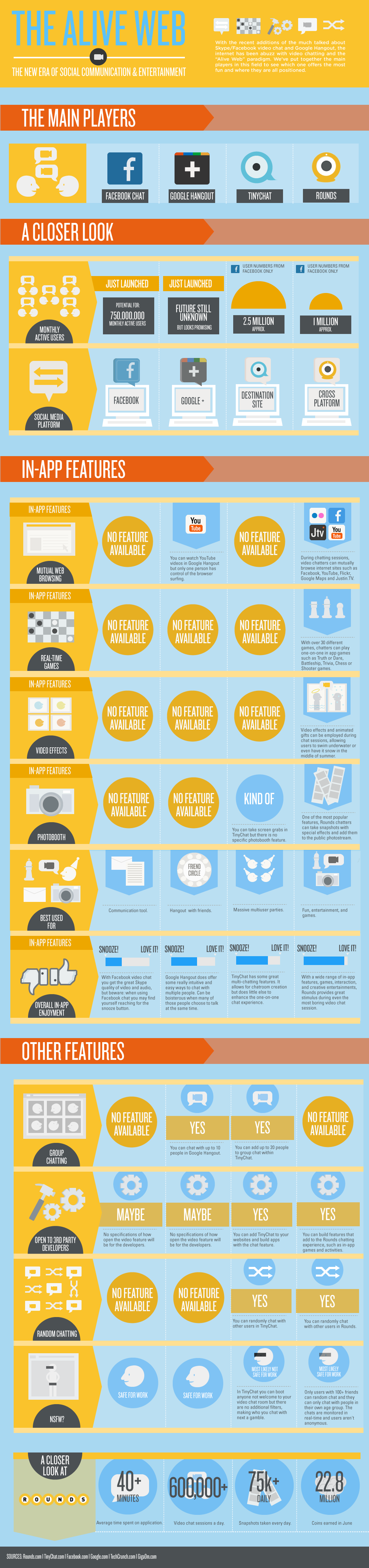 With over 600,000 chat sessions daily, the company looks poised to hit the “big time.” Will it steal some thunder from the recently-introduced features that juggernauts Google and Facebook revealed? Time will tell, but here’s an infographic that tells us more about Rounds and how it stacks up.