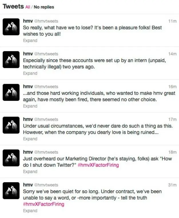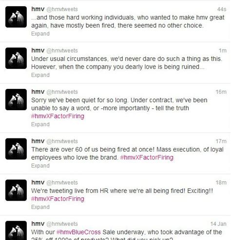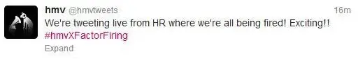 Such is the case for embattled British music retailer HMV. The company, already embroiled in a form of bankruptcy protection (see image from their website below) due to the shift towards digital music downloads, fired 190 employees today. At least one of those employees had access to the company’s Twitter account and gave a blow by blow report of the events as they unfolded. The Tweets have been since removed, but screenshots linger: