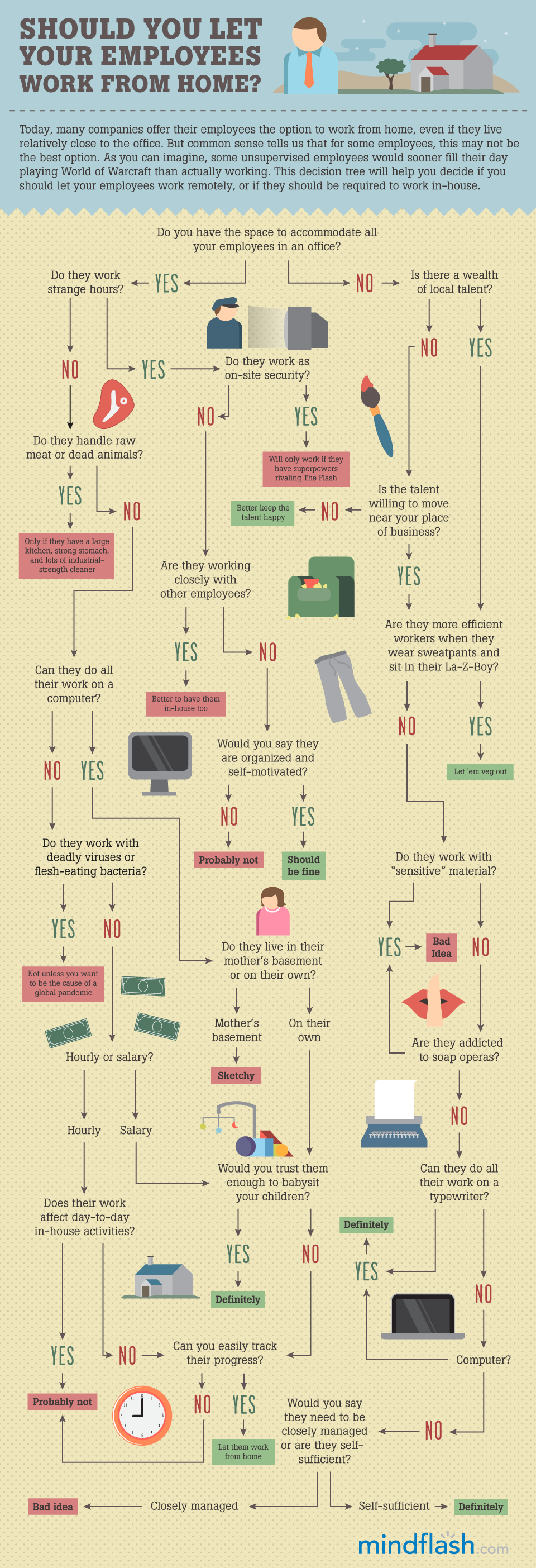 This flowchart from Mindflash can be used to determine whether it’s a good idea or a bad idea to allow employees to work outside of the office. Click to enlarge.