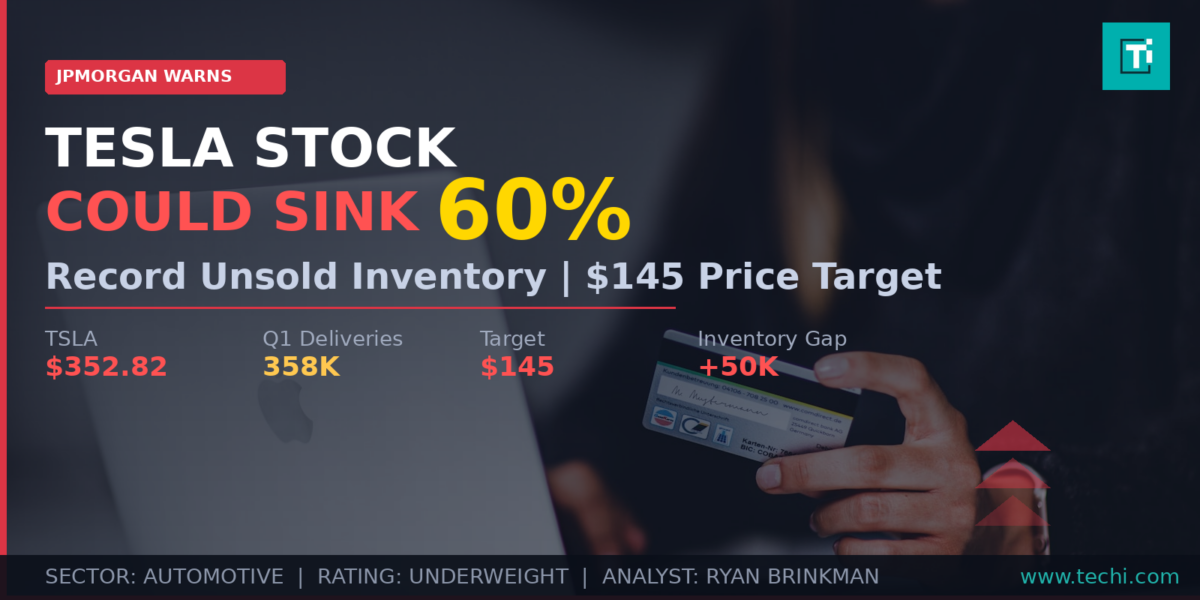 JPMorgan just doubled down on its most bearish call on Wall Street. On April 6, 2026, lead automotive analyst Ryan Brinkman reiterated his Underweight rating on Tesla (NASDAQ: TSLA) with a $145 price target — implying roughly 60% downside from the stock’s current price of $352.82. The warning comes just days after Tesla reported Q1 2026 deliveries that missed expectations and revealed the largest production-delivery gap in company history.