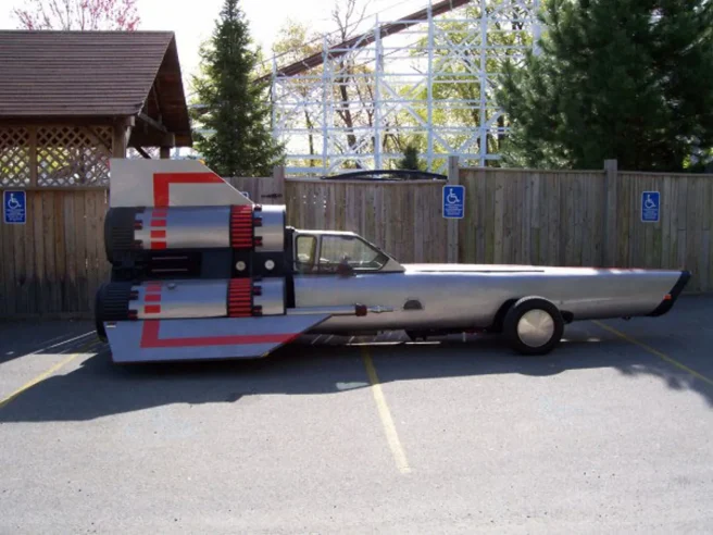 This formal US Postal Service Jeep has been transformed into a contraption that the most hardened fighter jock could climb into after a night of gambling and hard drinking of ambrosia in the pilot’s mess. Yes, Dean Shorey, the master ride mechanic for Seabreeze Amusement Park in Rochester, NY has created a vehicle that may actually make a hardened geek cry more than a silver Delorian.