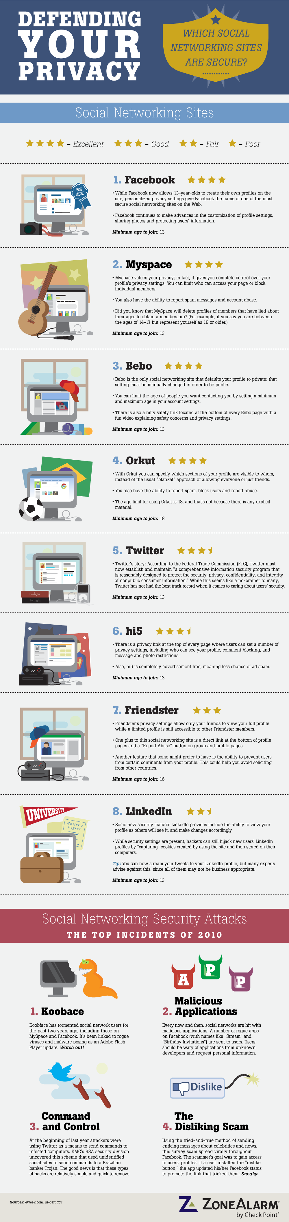This graphic by ZoneAlarm ranks 8 of the top social networks according to their current security standards and describes four of the most famous instances of social networking security breaches. Click to enlarge.