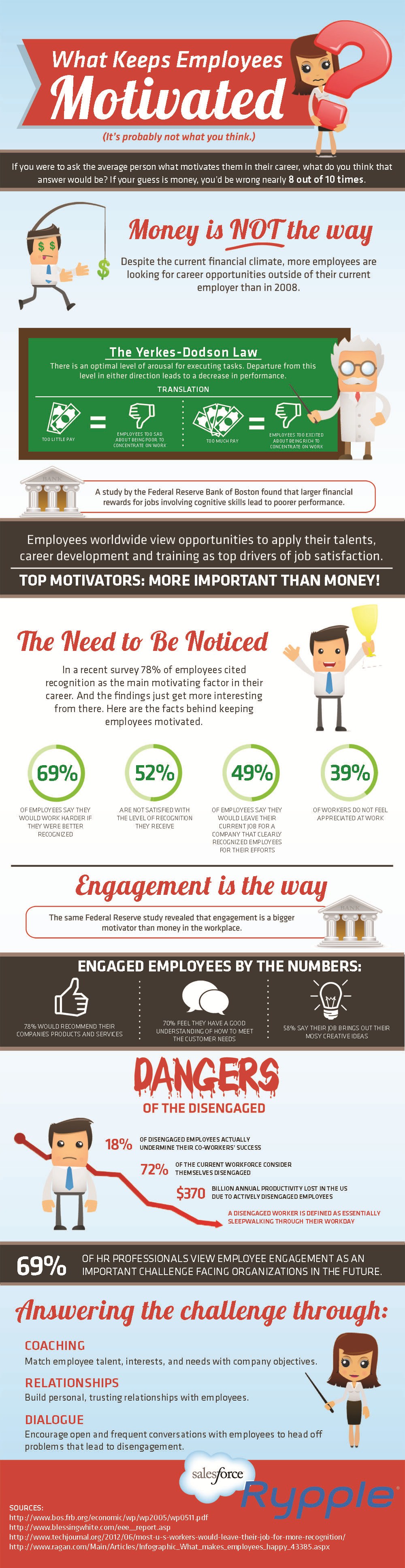 In their infographic titled How to Motivate Employees, Salesforce Rypple breaks down some of the other factors that go into keeping workers happy. As with many of the things that are happening in the world, it’s clear from the graphic that software for tracking engagement may be a necessity in keeping employees fully-motivated.
