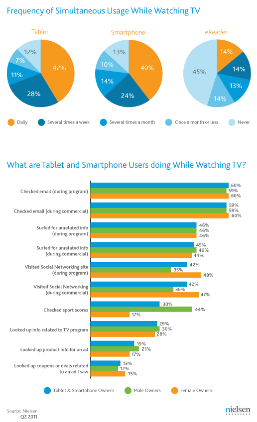 It has been speculated that home entertainment would meld with online and app-based engagement more and more over time. Today, Nielsen revealed that 40% of tablet and/or smartphone owners use them while watching television.