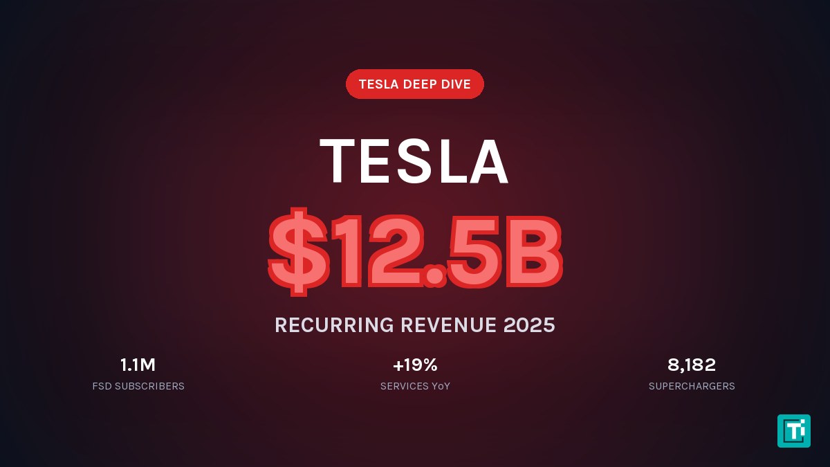 Tesla’s services and other revenue line came in at $12.53 billion for full-year 2025, up 19 percent year-over-year, and the energy business added another $12.8 billion at +27 percent. Together that is more than $25 billion of non-automotive revenue annually. Within the services line, the largest recurring contributors are paid Supercharging, FSD subscriptions (1.1 million active users at the end of 2025, of which roughly 330,000 are on the monthly recurring tier), Tesla Insurance, and Premium Connectivity.