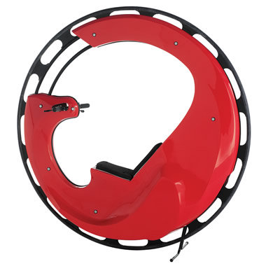 It seats one person, as you can see from the picture and moves in a circular motion. Powered by a 31cc, four-stroke 1 1/2-hp engine moving the wheel functions by using a centrifugal clutch on its inner steel frame to employ the larger 67″ diam. outer flywheel that then makes contact with the rubber tire on the ground. As you can see, there is no steering wheel; in fact, you are the steering wheel by moving side to side, much like when riding on a scooter.