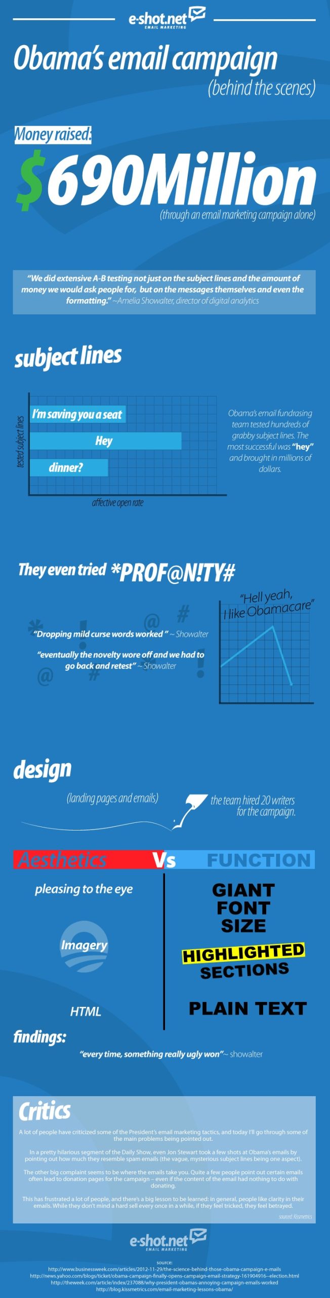 This infographic below breaks down the successful use of email campaigning as a tremendous fund-raising tool. Some of the other interesting findings that led to $690 million in funds raised for the campaign include the use of mild curse words and the opinion that the uglier layouts seemed to work the best.
