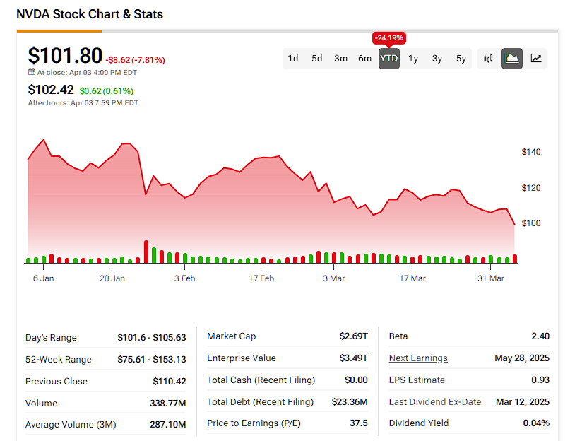 The market turbulence due to Donald Trump’s “Liberation Day” tariffs inflicted a serious blow on Nvidia, becoming a symbol of a typical risk-on stock whose fortunes, like many, appear tied with global trade and geopolitics. This company saw its stock decline of 6.69% this week, bringing the year-to-date losses to almost 25%. Despite Nvidia being a fundamentally strong stock with leadership in the GPU market, high margins, and solid valuations, it is also highly volatile. To some investors not concerned in long-term holding, this roller coaster ride could translate into a risky bet. Tariffs and supply chain constraints may derail Nvidia’s near-term performance.