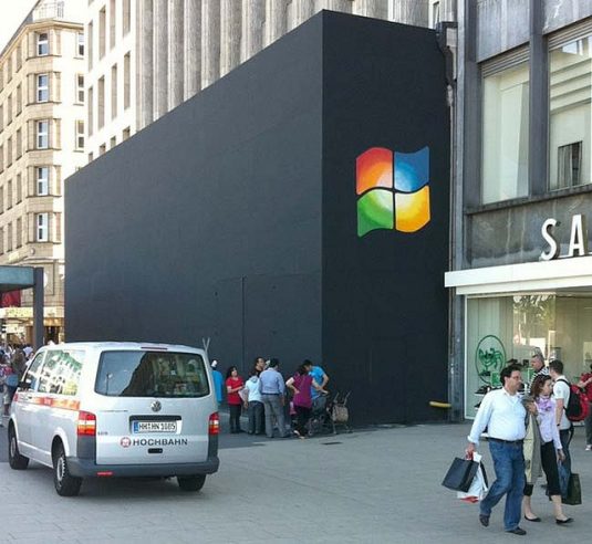 All it takes sometimes is desire, some sheet metal, and orange vests. As you can see in the video below, they nonchalantly walked up with a ladder, “installed” the windows logo on the side of the construction facade, and walked away. At the end of the video, notice that a passerby quickly started snapping shots with her camera.