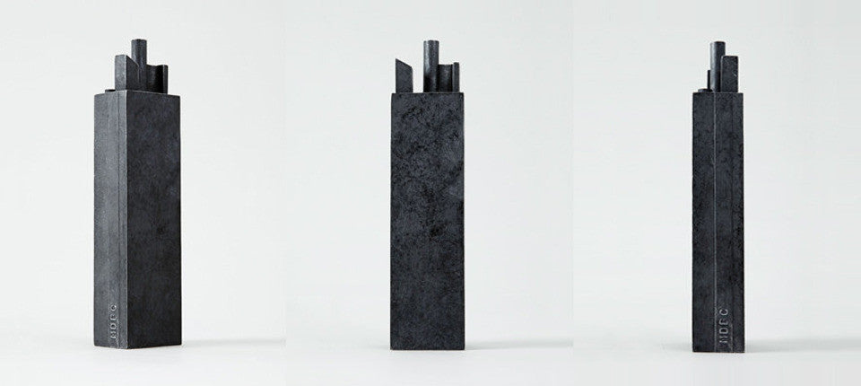 The MDBC Totem is both a sculptural representation of the themes explored in Black City and a symbolic conduit to the music itself. Vaguely reminiscent of one of the soot-blackened skyscrapers that might populate Dear’s creeping, nameless city, the stacks upon the totem also call to mind the many shaped prongs of a universal power adaptor. In this sense, the totem is not simply a miniature building, but an abstract key to an unknown door. The branding of the totem has been purposefully reduced to its bare essentials—only the letters MDBC and unique three-digit suffixes are included—so that the totem’s meaning remains discernible only to its beholder.