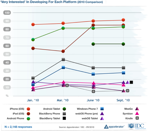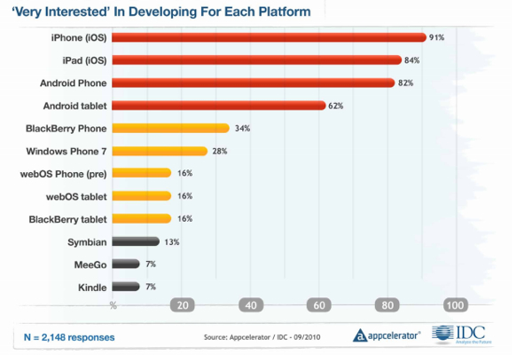 2,148 developers were surveyed in the Q4 Mobile Developer Report (PDF) by Appcelerator and IDC. The verdict: developers are not as interested in developing for Windows Phone 7 as they are with iOS, Android, and Blackberry. Only 28 percent of the respondents replied that they were “very interested” in developing for Windows Phone 7, as compared to iOS and Android, which, respectively, pegged 91 percent and 82 percent of the respondents as “very interested.”